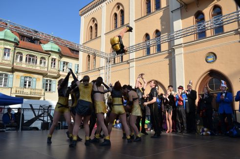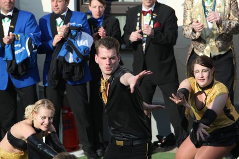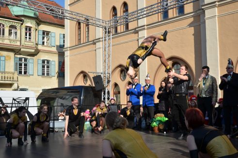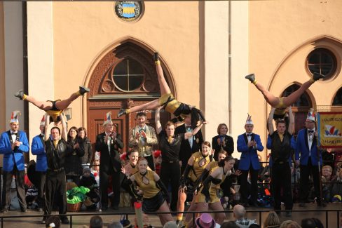 Los ging es im Rathaus beim Mitarbeiterfasching. Wir durften im Eingangsbereich im schönen Gewölbe unser Programm zeigen. Anschließend ging es zum @cafe.hofberg zum Seniorenfasching. Hier durften wir traditionell unseren Marsch und Walzer zum Besten geben. Als Schlusspunkt waren wir zu Gast auf der Bühne auf dem Hauptplatz direkt vorm Rathaus. Bei strahlendem Sonnenschein waren viele Zuschauer gekommen und die Garden auf der Bühne anzufeuern.